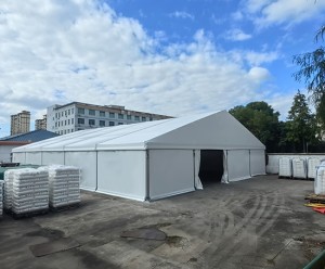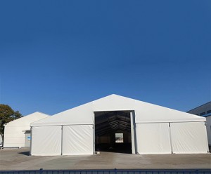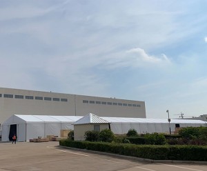 這2座工業鋁合金篷房規格分別為寬度為12米,長度為17米,邊高為3米,配置都是一樣的全篷布搭配雙開門。還有一座為寬度為10米,長度20米,邊高3米,這2座篷房主要是堆放臨時周轉生產物料,充分利用了廠區的土地資源,緩解對倉庫需求的壓力。