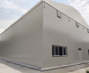 這座篷房寬度為20米,長度70米,高度4米。框架采用的鋁合金材質,四周選用PVC篷布,滿足了安裝快速的要求。關于抗風能力,我們設計部根據使用地區50年一遇的風荷載進行設計,這座鋁合金工業倉庫篷房抗風達到了11級,即便在惡劣的天氣,這座篷房都能無懼影響、為材料保駕護航.