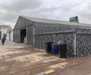 交付了 4 座迷彩工業倉儲篷房,其中規格分別為:7.5?50,3.7?15,6?6,12?16總面積接近 660 平方米